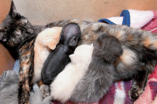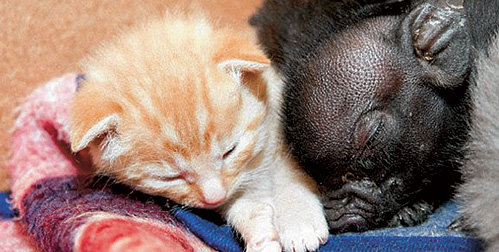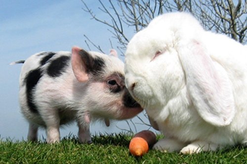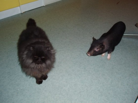 Миниатюрные свиньи прекрасно уживаются с другими домашними животными, особенно если растут с ними вместе. Прекрасно живут с собакой, хорошо общаются, иногда спят рядом, согревая друг друга. Однако когда дома никого нет, мини-пига лучше держать в отдельной клетке. А когда приходите домой - выпускайте поросенка. Он тутже обязательно начинает толкаться пятачком, радостно похрюкивать, тереться боками о ноги, просит почесать. Если начать почёсывать бок – мини-пиг сразу падает на спину и подставляет свой животик.
