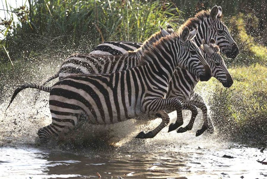 Вообще, зебры наряду с антилопами гну составляют самую массовую добычу львов, гиен, гиеновидных собак. Реже на них охотятся леопарды и гепарды. На водопоях и во время миграций зебры часто становятся добычей крокодилов. Противопоставить хищникам зебры могут лишь скорость и удары задними ногами, которыми они иногда пытаются отбиться от преследователя. В случае если хищник действует один это иногда срабатывает, но при групповой атаке зебры обречены.